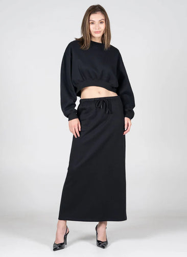 A midi skirt with two side pockets, a back slit and a thin band drawstring.